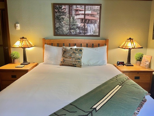 Every element has been thoughtfully selected to transport you back to an earlier time, but with modern conveniences. Classic Mission-style oak furniture, radiant Tiffany-style lamps, captivating art glass windows and signature Teco-style pottery. Each piece evokes the spirit of Wright’s designs.